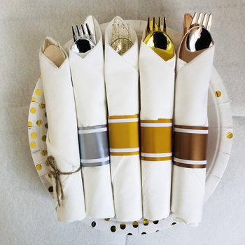 Juego de cubiertos desechables de primera calidad para fiesta, boda, Festival (tenedor/cuchillo/cuchara preenvuelto con servilletas blancas)